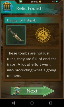 The Dagger of Tishpak is a Relic found in Lara Croft: Relic Run. It is the fifth relic that can be found in the Desert Ruins level after collecting nine clues.