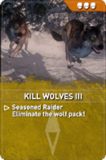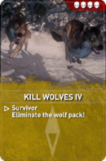 Kill Wolves is a set of Remnant Resistance Expedition Cards in Rise of the Tomb Raider to be used when designing Remnant Resistance missions. These are objective cards and each tier is associated with a different level of difficulty.