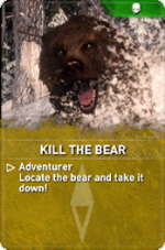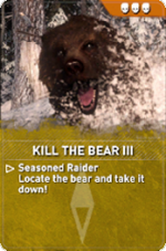 Kill the Bear is a set of Remnant Resistance Expedition Cards in Rise of the Tomb Raider to be used when designing Remnant Resistance missions. These are objective cards and each tier is associated with a different level of difficulty.
