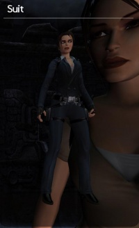 Suit is one of the unlockable outfits in Tomb Raider Legend. It can be picked after unlocking it and choosing it from the menu when replaying a level.
