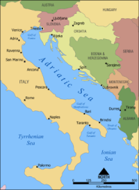 The Adriatic is located between the Balkans and Italy