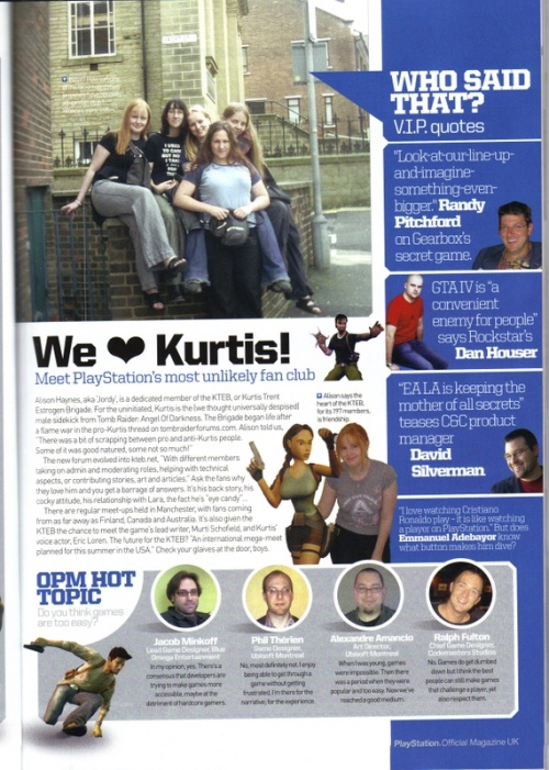 | + | The KTEB's mission is to promote the merits of Kurtis and, to a lesser extent, the game that he is featured in - namely, Tomb Raider: The Angel of Darkness. Their efforts have helped Kurtis be voted the [http://4thegirlgamers.blogspot.com/2006/06/top-ten-hottest-video-game-guys.html 8th hottest male video game character] in a poll by TheGirlGamer.net.[http://4thegirlgamers.blogspot.com/] Playstation Magazine UK dubbed the KTEB 'one of the internet's most feared lobbying groups'.[http://img155.imageshack.us/my.php?image=playstationmagazineis5.jpg] | ||