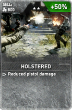 '''Holstered''' is one of the [[Expedition Cards]] in [[Rise of the Tomb Raider]] to be used in one of the [[Expeditions]], like [[Score Attack]], [[Chapter Replay]], [[Chapter Replay Elite]], [[Remnant Resistance]] and [[Endurance Mode]].